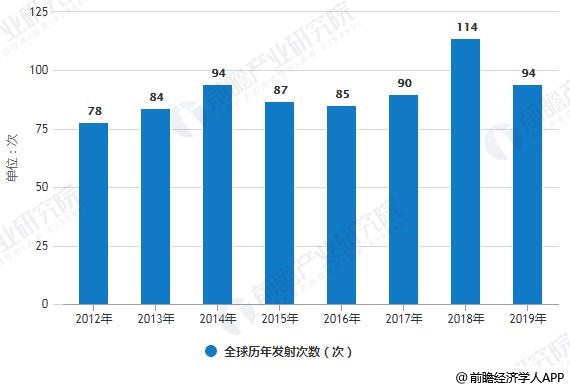 根据美国联邦航空管理局(FAA)统计数据,2018年全球发射次数总计114次,其中中国发射次数39次、位列榜首;美国发射次数34次(其中21次由SpaceX完成),位列第2。