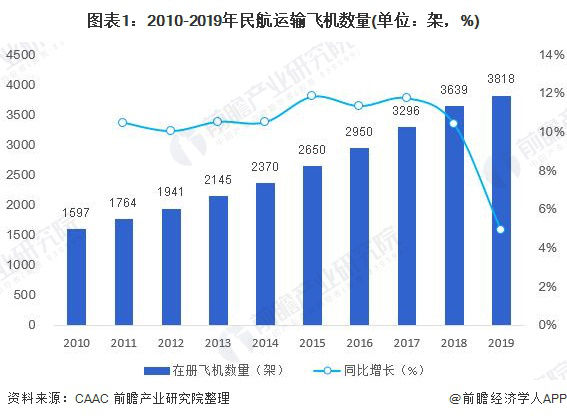 根据民航局数据显示,2010-2019年,我国民航运输飞机数量呈逐年增加态势,截止2019年年底,中国民航全行业运输飞机在册架数3818架,比上年底增加179架,同比增速为4.91%。