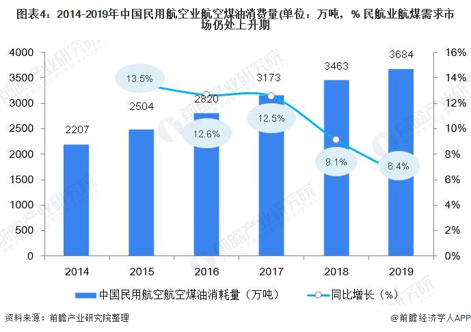 2018年,中国民用航空业航煤消费量为3463万吨,2019年航煤消费量为3684万吨,同比增长6.4%,民航运输业航煤消费量占全国航煤表观消费量的95.7%。