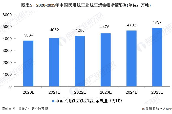 未来5年,民用航空业仍将处于上升期,到2025年,中国民用航空煤油需求量将达到4937万吨左右,年复合增长率为5%。