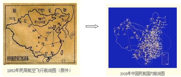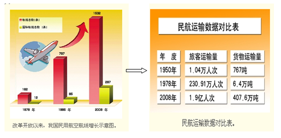 民航业的发展轨迹见证了我经济的迅速崛起。如下图所示,从建国初,国内航班线路屈指可数,到2008年航线星期罗布;特别是改革开放以来,民航业出现了前所未有的景象,在1978年至2008年这20年里,旅客运输量增长82.3倍,货物运输量增长63.7倍。