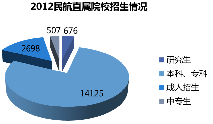 (2)进一步增强院校对民航特有专业人才的培养能力,满足行业对专业人才的需求,建立专业人才储备。遵循人才成长规律,组织实施“民航重点专业人才培养计划”,构建分层分类的专业技术人才培养体系。进一步完善民航局特聘专家和中青年学术技术带头人制度。截至2012年底,我国共有科研院所2个,科研基地11个。2012年,民航直属院校共招收学生18006 人,其中,研究生676人,普通本专科生14125人,成人招生2698人,中专生507人。