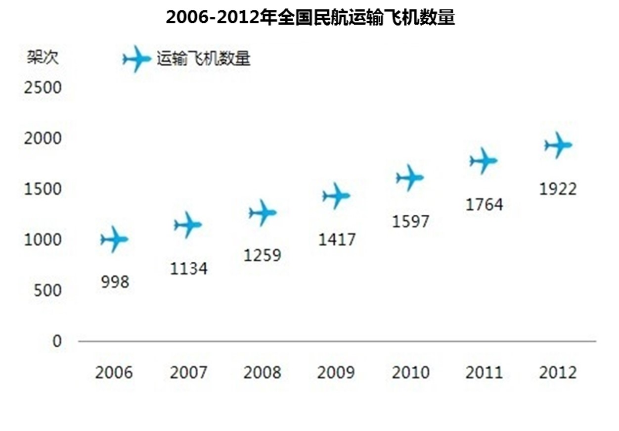 自2012年,我国民航累计完成旅客运输量3.19亿人次,同比增长9.2%,民航运输机场旅客吞吐量6.8亿人次,比上年增长9.5%;民航全行业运输飞机期末架数1941,比上年增加177架,运输机场183个,比上年增加3个。目前,国内共有36家客运航空公司开辟了定期航班航线2457条,约100家外国航空公司开辟了至我国的国际航线。