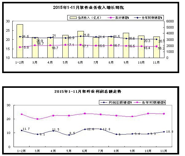 从行业总体规模上看,进入本世纪以来,我国软件和信息技术服务业发展迅速。2015年,我国软件和信息技术服务业延续稳中趋缓态势,收入增速回落,但效益保持平稳增长;产业结构不断调整,传统行业领域增长明显放缓,新兴领域持续蓬勃发展。据工业和信息化部《2015年1-11月软件业经济运行情况》统计,2015年1-11月,我国软件和信息技术服务业完成软件业务收入38217亿元,同比增长16.2%,增速低于去年同期3.9个百分点;完成利润总额4422亿元,同比增长10.8%,增速低于去年同期12.9个百分点。