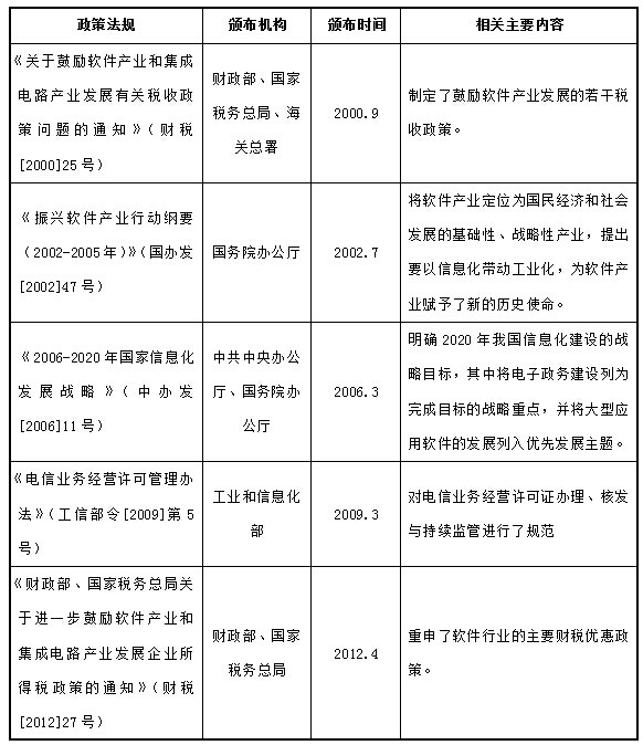 2000年以来,国务院先后发布了《鼓励软件产业和集成电路产业发展的若干政策》和《进一步鼓励软件产业和集成电路产业发展的若干政策》,从财税、投融资、研究开发、进出口、人才、知识产权、市场等方面给予了较为全面的政策支持,同时原信息产业部、工业和信息化部围绕软件企业所得税、软件增值税等政策重点,加强沟通协调,及时落实税收优惠政策,研究制定了软件企业认定管理办法,修订软件产品管理办法,进一步完善了政策落实和行业管理的基础性、专业性制度,为产业快速发展营造了良好环境。经过全行业的共同努力,我国软件和信息技术服务业步入快速发展阶段,形成了较为完整的技术和产业体系。