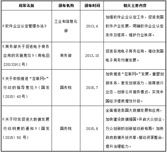 公司处于国家行业政策鼓励和重点支持发展的行业。发展和提升软件和信息技术服务业,对于推动信息化和工业化深度融合,培育和发展战略性新兴产业,建设创新型国家,加快经济发展方式转变和产业结构调整,提高国家信息安全保障能力和国际竞争力具有重要意义。为此国家出台《国务院关于印发进一步鼓励软件产业和集成电路产业发展若干政策的通知》、《国务院关于加快培育和发展战略性新兴产业的决定》、《软件和信息技术服务业十二五发展规划》、《关于印发促进大数据发展行动纲要的通知》等政策,从税收、研究经费、进出口优惠、人才培养、知识产权保护、市场开发和投融资等方面给予了较为全面的政策支持。根据国家发展规划,预期未来国家还将出台更多针对软件和信息产业的专门政策,这将有力地推动我国软件和信息产业的健康稳步发展。