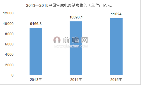 前瞻产业研究院提供的《2016-2021年中国集成电路行业市场需求预测与投资战略规划分析报告》指出,2013年我国集成电路市场销售额约为9166亿元人民币,同比增长7.1%;2014年销售额突破万亿元,达10393.1亿元,同比增长13.4%;2015年集成电路销售额为11024亿元,同比增长6.1%。