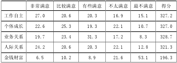 根据相关资料分析可知,我国高科技术知识型员工对激励政策满意度方面,对金钱财富的满意度最低,即高新技术知识型员工对自己的薪酬待遇不满意,最不满意程度达到53.1%,不太满意达21.6%。高科技术知识型员工对工作自主的满意程度最高,得分为327.2。员工认为非常满意达27.0%,比较满意为20.6%。个体成长、业务关系、人际关系的满意程度大体差不多。