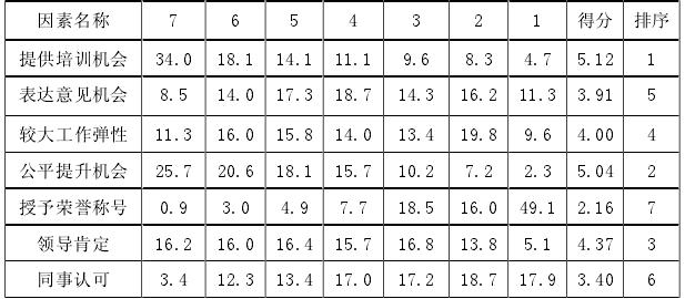 根据相关数据分析可知,我国高新技术知识型员工对培训机会的需求最高,得分为5.12分,排名第一,说明知识型员工对培训的看重,希望自己能够得到提升。从另外一个方面可以分析得知,我国高科技术企业对知识型员工的培训机会提供得较少,不能满足员工的需求。其次,员工对公平提升的机会需求较高,得分为5.04分,在员工个人发展的需求度排名第二。这说明员工的晋升存在不公平的现象。再有,员工希望能够得到企业领导的肯定,从而达到员工自我价值的实现,这个得分为4.37分,在员工个人发展的需求度排名第四。