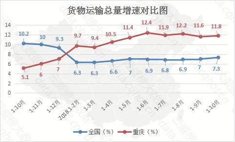 2018年1-10月,全国货物运输量为413.64亿吨,同比增长7.3%,累计增速比上月增长0.3个百分点。重庆区域的货物运输量为10.47亿吨,累计增速比上月增长0.2个百分点。