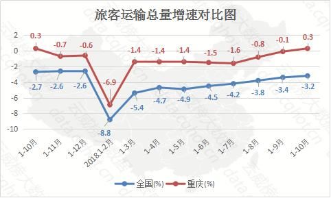 2018年1-10月,全国旅客运输量为151.61亿人,同比下滑3.2%,累积增速比上月增长0.2个百分点。重庆区域的旅客运输量为5.39亿人,同比增长0.3%,累积增速比上月增长0.4个百分点。