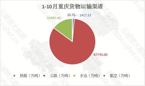1-10月,重庆运输货物共104718万吨,其中公路运输是主要渠道,运货量为87795万吨,同比增长13.6%;水运运输的运货量为15495.91万吨,同比增长4.3%;铁路运输、航空运输情况低迷,分别运货量为1417.17万吨、10.76万吨,同比下降7.2%、0.4%。