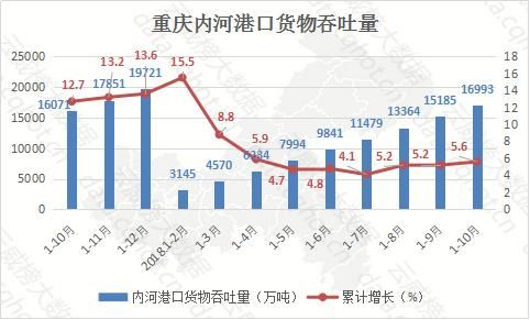 1-10月,重庆区域内河港口货物吞吐量为16993万吨,同比增长5.6%,增速比1-9月增长0.4个百分点。2017年年末和2018年年初吞吐量与同期相比增长较大,2月份之后开始紧缩,呈低速稳定增长。