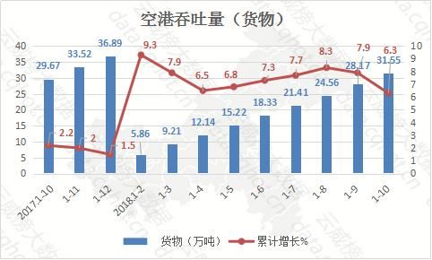 1-10月,重庆空港货物吞吐量为31.55万吨,同比增长6.3%,增速比1-9月下降1.6个百分点。