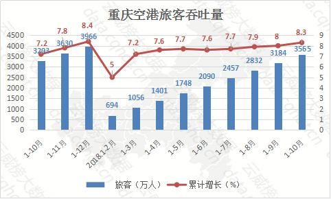 在旅客吞吐量方面,1-10月重庆空港旅客吞吐量为3565万人,呈现快速稳定的增长趋势,同比增长8.3%。