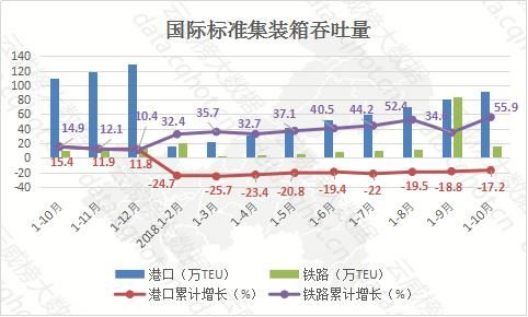 铁路运输方面,1-10月运输的货物量为16.37万TEU,同比增长55.9%,增速比上月增长21.3个百分点。与同期相比,呈现巨幅上升趋势。