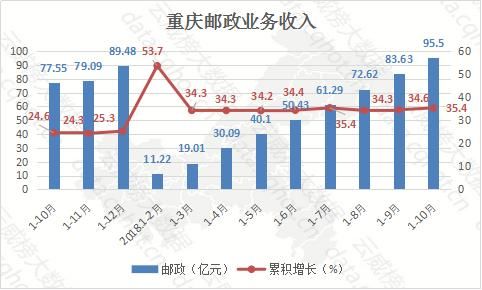 1-10月重庆邮政业务共收入95.5亿元,业务量稳定快速上升,同比增长35.4%。1-2月同比上升最高,达到53.7%,之后稳定在34.3%左右。