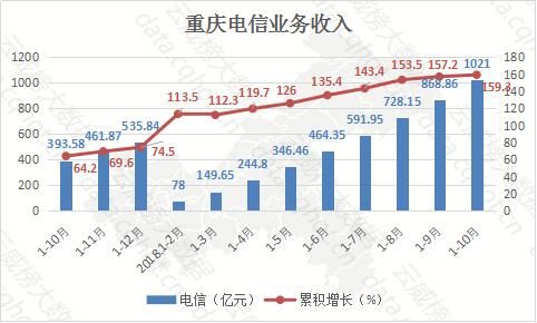 1-10月,重庆电信业务共收入1021亿元,同比增长159.3%。自年初,互联网业务迅速发展拉动电信业务快速增长。重庆电信业务成井喷式的上涨,每月同比增长均保持在110%以上。