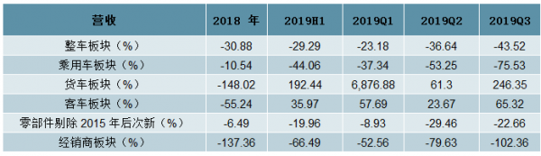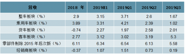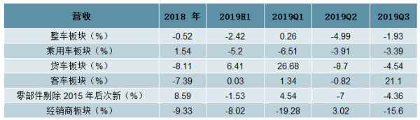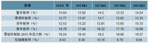 1)营收增速方面:2019年Q3整车板块实现营收增速-1.93%,零部件板块实现营收增速-4.36%,经销商板块实现营收增速-15.60%。整车细分板块方面,乘用车同比下降3.39%,客车同比增长21.1%,货车同比下降4.54%。乘用车板块营收端自2018年Q3以来呈现负增长,主要是乘用车销量下行造成的,该趋势在19年下半年起逐渐好转。