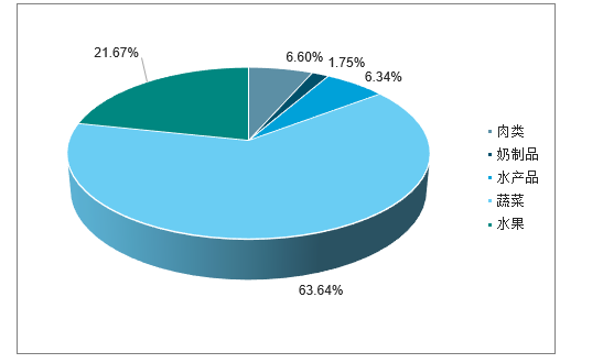 目前,山东省冷链物流相关农产品主要包括蔬菜、水果、肉类、奶制品以及水产品,2018年,全省蔬菜产量为8192.0万吨,同比下降22.9%,占全省主要冷链物流农产品的63.64%;水果产量为2788.8万吨,同比下降15.4%,占比为21.67%;水产品产量为816.6万吨,同比下降7.4%,占比为6.34%;肉类产量为849.3万吨,同比增长10.0%,占比为6.60%;奶制品产量为225.1万吨,同比下降15.4%,占比为1.75%。