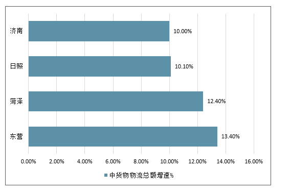 2018年,山东省物流行业运行呈现出稳中有进的态势。上半年,全省实现社会物流总额9.28万亿元,同比增长7.1%,预计全年将实现社会物流总额21.8万亿元左右。上半年,全省17个地市中货物流总额排名前三位的是青岛、临沂和济南,分别完成1.4万亿元、1.3万亿元、1.1万亿元;增长率方面,上半年增速超过10%的地市有东营(13.4%)、菏泽(12.4%)、日照(10.1%)和济南(10.0%)。
