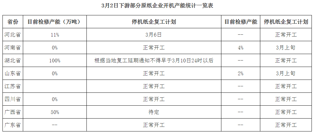 2月份下游纸厂延期开机复工,已开机企业限产运行,开工负荷受限,据卓创资讯不完全统计,2月份导致32万吨或以上的纸浆消耗量被延期释放,不过伴随着纸浆消耗速度的提升,加之物流新政推出后,或利于进一步带动浆市放量速度。在新政影响下,纸浆贸易环节、造纸企业成本面均受益。