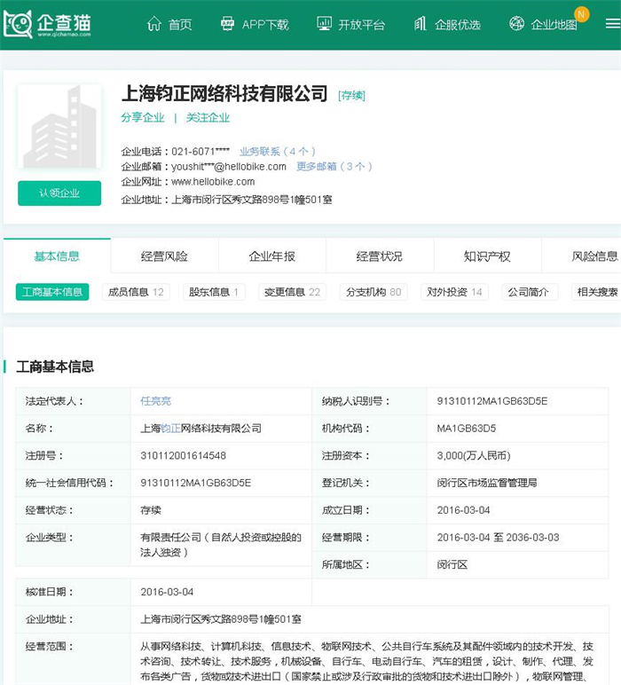 企查猫资料显示,哈啰出行隶属于上海钧正网络科技有限公司,法定代表人任亮亮,注册资金3000万元,主要从事网络科技、计算机科技、信息技术、物联网技术、公共自行车系统及其配件领域内的技术开发、技术咨询、技术转让、技术服务,机械设备、自行车、电动自行车、汽车的租赁等业务。