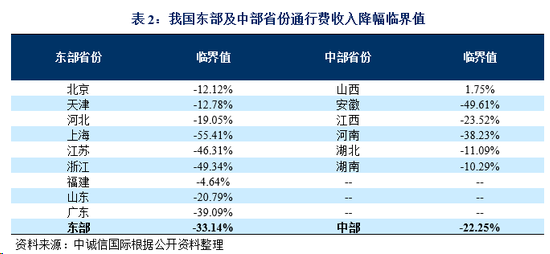 基于上述内容,从新冠肺炎疫情对各省收费公路信用风险水平影响的角度出发,选取收费公路现金流对利息支出的覆盖作为分析指标,利用敏感性分析中的临界值工具,来衡量没有其他新增外部支持和其他内部收入增长因素影响,为保障收费公路现金流入对刚性支出和利息支出的覆盖,各省收费公路通行费收入的最大降幅。临界值分析的区域样本为疫情感染较为严重的中部和东部省份,同时还假设刚性支出和利息支出保持不变,收费公路数据以2018年全年数据为计算基础。根据以上假设基础计算得出的东部(海南省2018年收费公路数据未公开)和中部各省份通行费收入最大降幅数据如下: