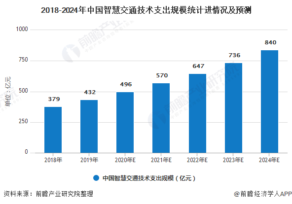 预测未来五年,中国智慧交通市场将保持高速增长趋势。智慧交通作为智慧城市建设中的主要组成部分,IT建设支出占比约为27%,2019年,中国智慧交通技术支出为432亿元左右,2024年,中国智慧交通技术支出规模将达到840亿元左右。