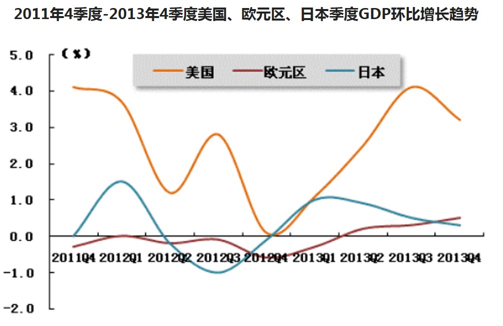 图1:2011年4季度-2013年4季度美国、欧元区、日本季度GDP环比增长趋势
