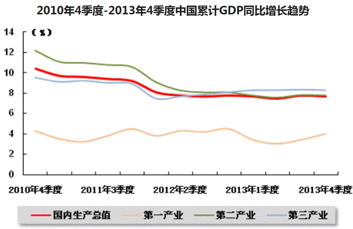 我国经济增长速度从2010年4季度到2013年4季度,整体趋势趋于平稳,上下波动不大。2013年全年国内生产总值为568845亿元,比上年增长7.7%。其中,第一产业增加值为56957亿元,增长4.0%;第二产业增加值为249684亿元,增长7.8%;第三产业增加值为262204亿元,增长8.3%。从环比看,四季度国内生产总值增长1.8%。