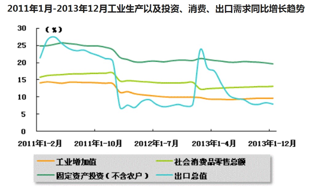 图3: 2011年1月-2013年12月工业生产以及投资、消费、出口需求同比增长趋势