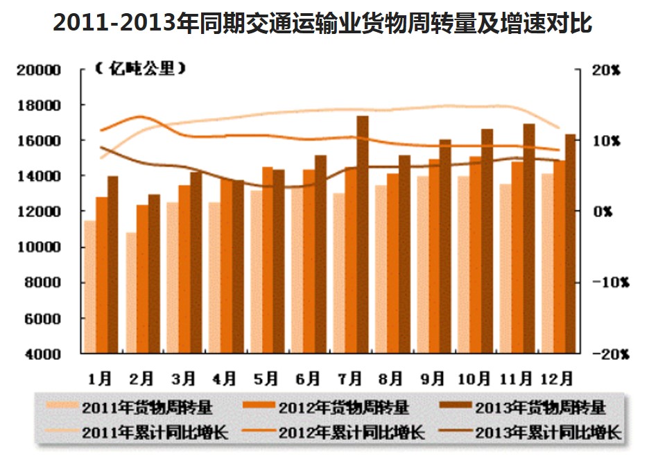 2013年,我国货物运输量处于持续增长的状态,由于受到国内经济的不确定因素的影响,2013年年中增长速度明显回落。下半年,我国经济开始稳步上升。同时,电子商务在下半年处于营销旺季,相应的货物运输总量增加,交通运输货运速度也不断提高。