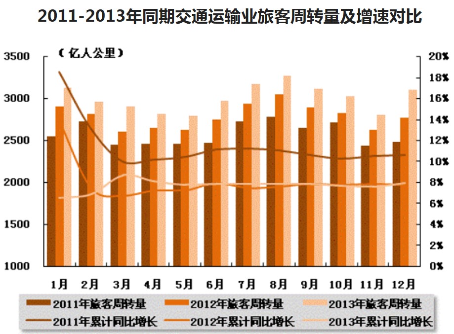 客运方面:2013年全年,全国主要运输方式累计完成客运量401.91亿人,同比增长5.63%,增速同比下降2.0个百分点,比2013年前3季度下降0.17个百分点;完成旅客周转量36035.98亿人公里,同比增长7.94%,增速同比加快0.24个百分点,比2013年前3季度加快0.14个百分点。