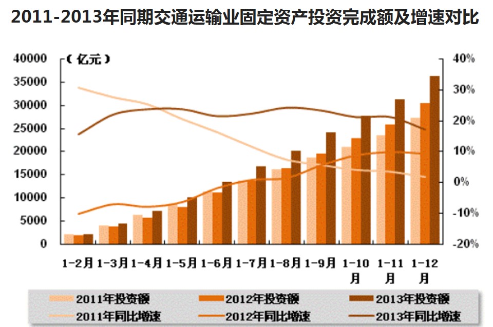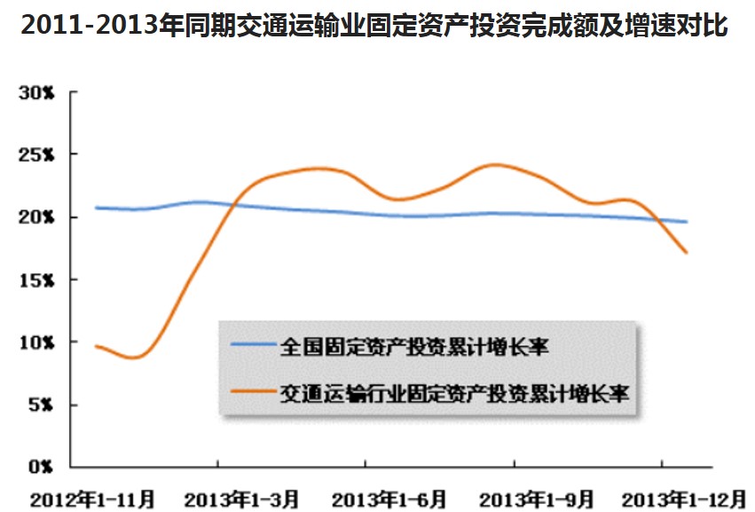 2013年全年,交通运输业固定资产投资增速较2012年同期有明显幅度的回升,交通运输汉语从2013年1季度后开始趋于稳定,伴有小幅度波动,各子行业增速均出现了正增长。投资结构进一步优化,各子行业的投资比重逐渐趋于均衡。根据国家统计局公布的数据显示,2013年全年,交通运输、仓储和邮政业累计完成固定资产投资36194.14亿元,同比增长17.2%,增速虽比2013年前3季度回落6.1个百分点,但较2012年同期加快8.1个百分点。