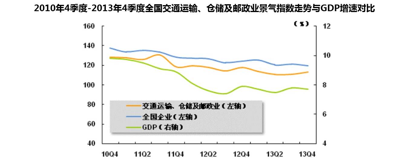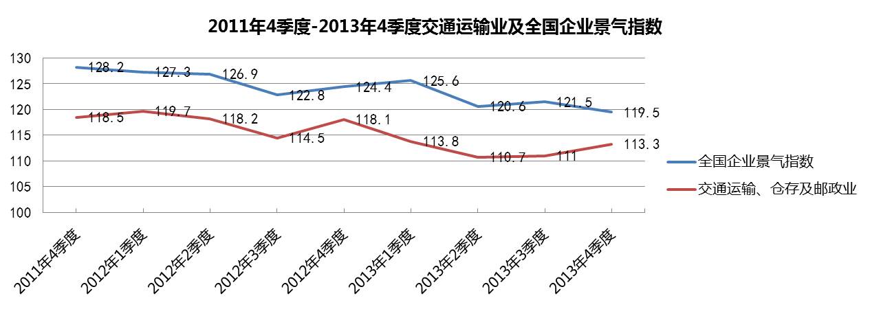 根据国家统计局发布的数据显示,2013年4季度我国企业景气指数为119.5,比2012年同期回落了4.9点,比2013年3季度回落了2.0点。其中,交通运输、仓储和邮政业企业景气指数为113.3点,比2012年同期回落了4.8点,但较2013年3季度上升了2.3点,与全国企业景气指数差距有所减少。同时,交通运输、仓存、邮政业企业景气指数高于100景气指数,表明我国交通运输业经济状态趋于上升阶段。