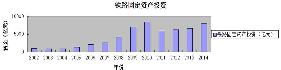 根据2002-2014年我国铁路固定资产投资分析显示:2002年我国铁路固定资产是963亿元,2002-2010年资产投资持续加速,特别是在2010年,投资达历史最高点为8427亿元。2010到2011年投资出现下滑趋势,但是在2011年-2014年投资稳步加速,2014年铁路固定资产投资总额达到8000亿元以上,投资总额即将逼近8427亿元的历史最高点,而且有可能创造新的投资最高记录。