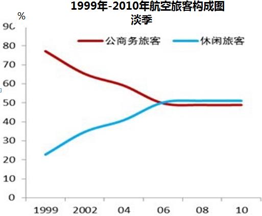 十年前,在我国,航空运输是高端行业,是商务人士的专用。如今,航空运输业呈现出大众化的特点。根据航空运输市场研究所在2010年的调查:淡季旅客人数比例,从1999年到2006年,航空运输旅客中以公商务旅客为主,但休闲旅客呈不断上升趋势。2006年至2010年,航空旅客休闲旅客略高于公商务旅客,此后两者的比例相对稳定。旺季时,这一时间点提前至2003年,而且休闲旅客的比重有进一步上升的趋势。