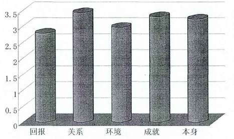 铁路员工的工作满意度由以下5种因素构成:工作回报、工作关系、工作环境、工作成就、工作本身,其平均得分情况如下图。根据下图分析可知,员工对工作关系的满意度最高,得分达到3.43。工作回报和工作环境的满意度为偏低,得分分别为2.78分、2.97分。