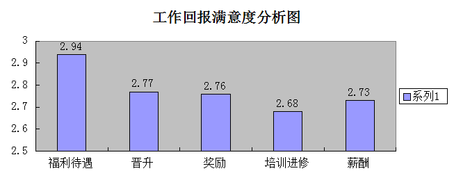 根据铁路员工工作满意度分析图分析表明:铁路员工对福利待遇满意度最高,分数达2.94分。其次分别是晋升、奖励、薪酬、培训进修的满意度,分别是2.77分、2.76分、2.73分、2.68分。