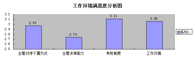 根据铁路员工工作环境满意度分析图分析表明:我国铁路员工对公司的考核制度相对满意,达3.11分。其次分别是工作环境和主管对待下属方式的满意度,分别是3.06分和2.97分。员工对主管决策能力满意度最低,分数为2.74分。