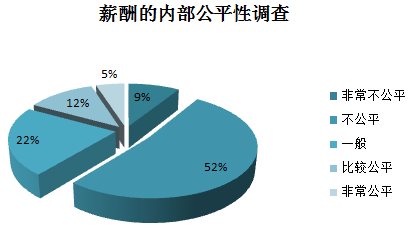 根据薪酬内部公平性图分析表明:职工对目前的工资分配制度并不认可。认为内部薪酬非常公平的只占5%;认为内部薪酬比较公平的占12%;认为一般的占22%。大部分员工认为内部薪酬不公平或者非常不公平,总共占61%。