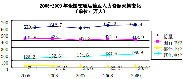 交通从业人员总量方面,在2005-2009年期间交通业从业人员整体变化趋势是相对平稳并呈现增长趋势。从业人员所在组织单位分布来看,国有组织类的从业人员数量变化幅度较大,出现下降趋势;集体单位的从业人员数量也出现下降趋势,其它类型组织的从业人员数量呈上升趋势。为了满足我国交通业快速发展的需求,我国交通运输业人力资源总量不断增长。通过交通企业和组织的分布格局中分析,民营类企业、组织的从业人员规模在不断扩大,说明越来越多的集体和民营类企业进入交通运输业,这些企业逐渐发展成长起来,组织规模不断变大。