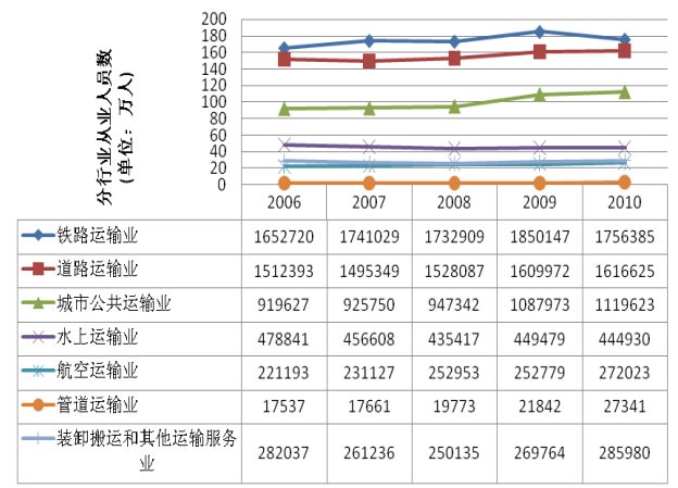 图2:2006~2010 年全国交通系统各分行业从业人员数量变化趋势图