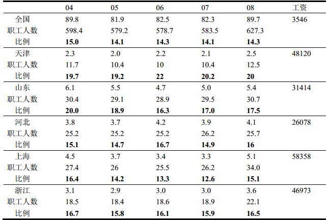 图3:2004—2008年全国各地区交通业城镇单位专业技术人员数及占职工人数比例以及2008年平均劳动报酬单位:万人(人数)、元(工资)、%(比例)