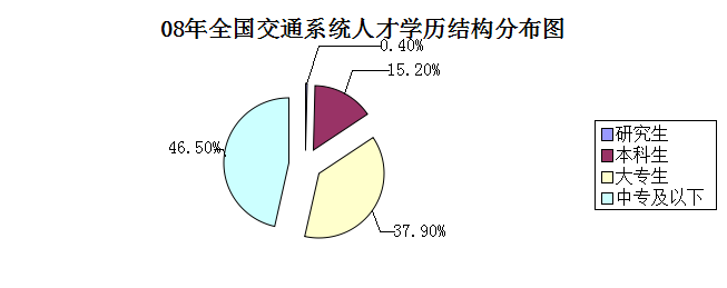 根据2008年全国交通系统人才学历结构图分析可知:研究生所占比例及其低,只有0.4%。中专及以下所占比例最多,达到46.5%。其次是大专生达到37.9%。本科生所占比例为15.2%,低于发达国家的交通系统人才的本科比例,发达国家的交通系统人才中本科生以上达到20%—25%。因此,我国交通系统的高学历人才比例有待提高。