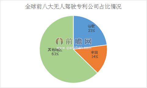 目前全球前八大无人驾驶专利专利最多的公司分别为谷歌、丰田、戴姆勒、通用汽车、博世、福特、波音与卡特彼勒。其中,谷歌占比22.89%,丰田占比14.46%,其他6家公司占比62.65%。