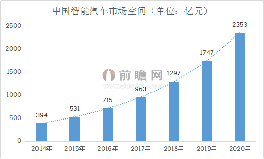 前瞻产业研究院提供的《中国智能汽车行业发展研究与投资前景分析报告》指出,2014年我国智能汽车渗透率为10%,带动的硬件、软件、电子、通讯、互联网等成本上升在2万到3万元,结合我国整车市场年增速3%的发展趋势,预计未来5年我国智能汽车年均复合增长率将达到35%,到2020年智能汽车市场空间可突破2300亿元。