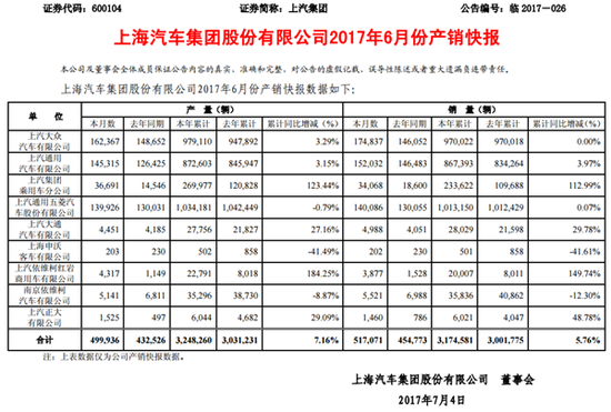 7月3日,上汽集团公布了6月产销快报,根据数据显示,6月份上汽集团销售各类汽车总计51.71万辆,同比增长13.7%;环比也有所增加,增长幅度为3.35%。从合资、自主乘用车销量表现上来看,同比都呈现不同程度的增长,其中上汽自主乘用车的增长较为强劲。至此,上汽集团在2017年上半年整车产量324.8万辆,同比增7.16%;整车销量317万辆,同比增5.76%。
