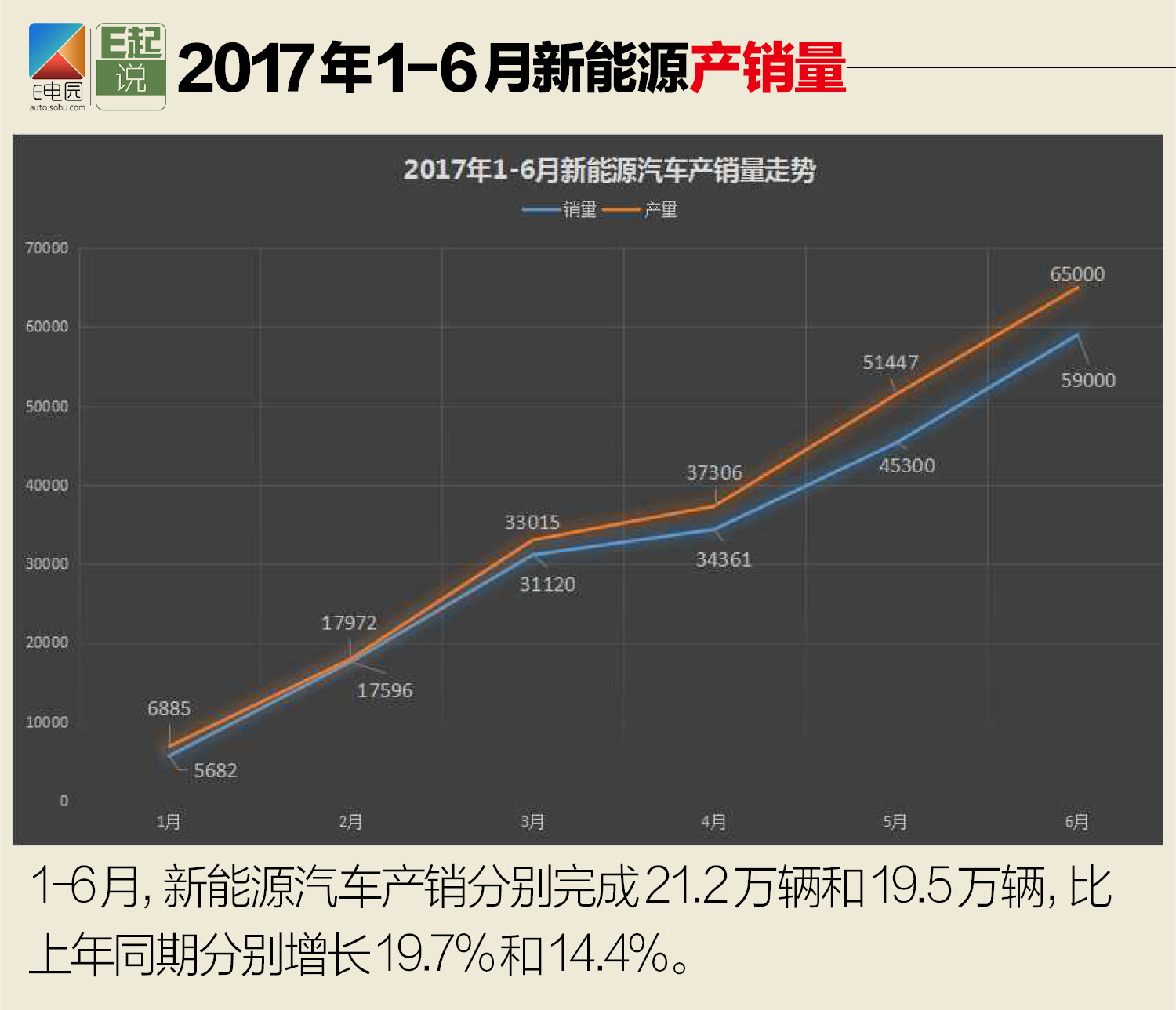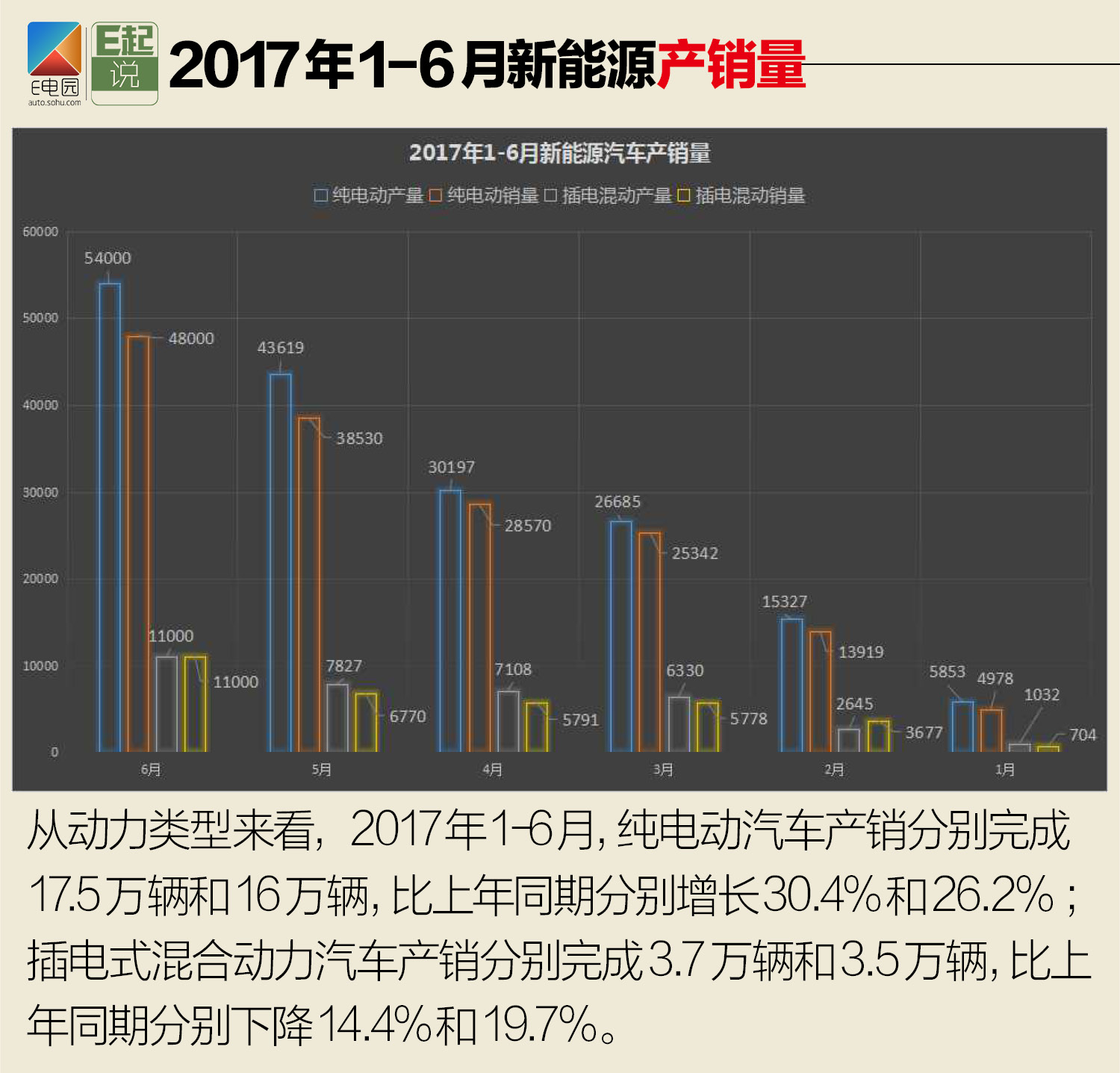 前不久,中汽协发布了今年6月新能源汽车的产销量数据,自此,2017年1-6月的新能源产销量数据出炉, 6月,新能源汽车产销分别完成6.5万辆和5.9万辆,同比分别增长43.4%和33.0%。其中纯电动汽车产销分别完成5.4万辆和4.8万辆,同比分别增长52.9%和41.4%;插电式混合动力汽车产销均完成1.1万辆,同比分别增长10.1%和5.3%。